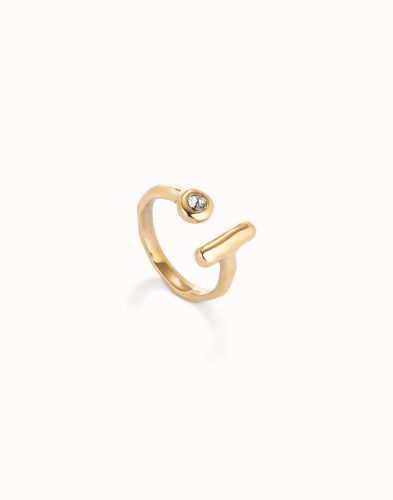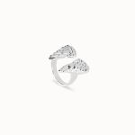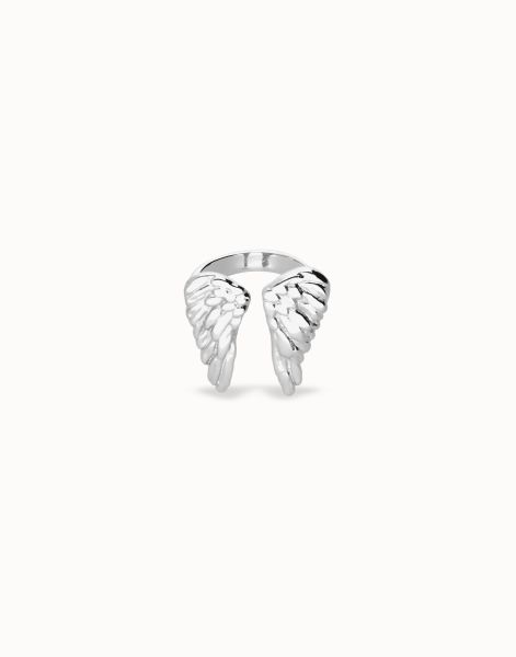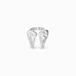 Este anillo abierto bañado en plata presenta dos alas simétricas que se enfrentan en un gesto de impulso y libertad.