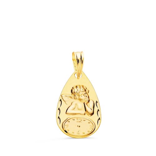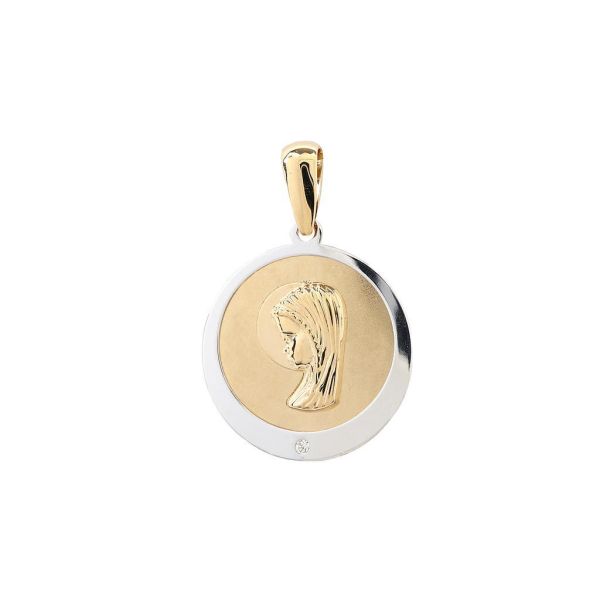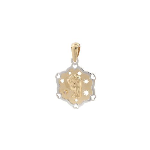 Medalla oro amarillo y blanco de 9K. Virgen niña con bisel liso en blanco y circonita .