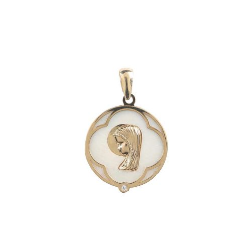 Medalla oro amarillo y blanco de 18K. Virgen niña con corazones y una circonita.