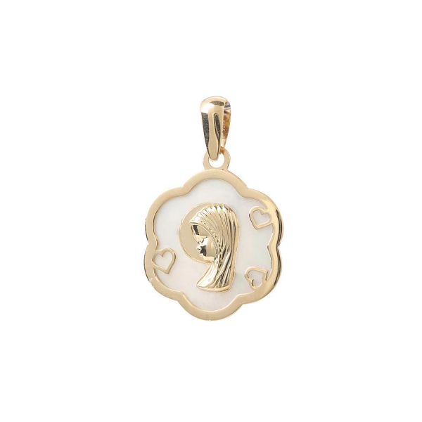 Medalla de oro amarillo de 18k, con forma de flor. Tiene la imagen de la Virgen niña con corazones calados sobre un fondo de nácar y bisel de oro.