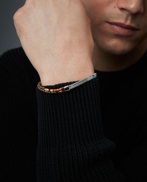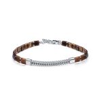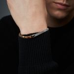Una pulsera que fusiona fuerza y sofisticación en un diseño único. Fabricada en plata de primera ley con un elegante baño de rodio, esta pieza presenta piedras naturales de ojo de tigre, conocidas por sus tonos cálidos y propiedades energéticas. El ojo de tigre, con su vibrante color marrón y dorado, aporta un toque de vitalidad y equilibrio. Con un largo de 19,5 cm más 3 cm de extensión, se ajusta cómodamente a la muñeca, convirtiéndola en una pieza versátil que puede complementar tanto looks casuales como formales. Ideal para hombres que buscan un accesorio lleno de carácter y distinción.