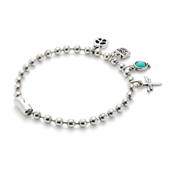 Diseño: Cadena con multitud de charms / abalorios — cristal turquesa, libélula, candado, símbolos decorativos — típico estilo boho-chic de UNOde50