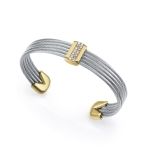 Una pulsera que irradia modernidad y elegancia con un diseño único. Fabricada en acero con acabado IP dorado, presenta múltiples cables unidos por una barra central, creando un efecto dinámico y fluido que le da un toque contemporáneo. Las circonitas blancas engastadas aportan un brillo sutil y sofisticado, realzando la pieza con destellos luminosos. Con un diámetro máximo de 5,8 cm, se ajusta cómodamente a la muñeca, convirtiéndola en un accesorio versátil y elegante para cualquier ocasión. Ideal para mujeres que buscan un diseño moderno con un toque de distinción y elegancia atemporal.