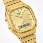 El AQ-240 analógico-digital con doble pantalla se vuelve retro-moderno. Con una esfera ligeramente rectangular compensada por una caja suavemente redondeada y suaves curvas metálicas, este reloj destila sofisticación.