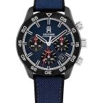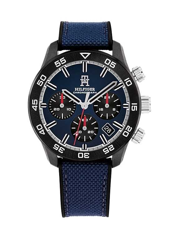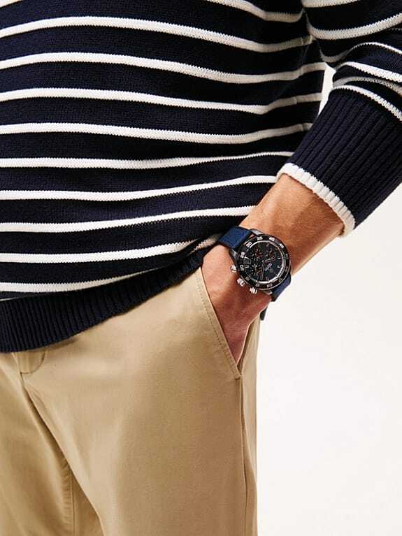 Reloj Tommy Hilfiger para hombre en acero inoxidable con correa de nylon en color azul y esfera azul con bisel en negro. Dispone de tres subesferas y marcadores en forma de barra.